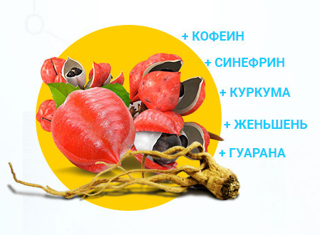 - Гуарана — богата кофеином; отличное тонизирующее и стимулирующее средство, происходит нормализация жировых обменных процессов, вырабатывается энергия.