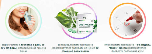 Инструкция по приему Экстраслим предельно проста: 1 раз в день необходимо запивать таблетку стаканом воды. Разрешается принимать по 2 пилюли, но только в случае явного превышения лишних килограммов для вашего роста.