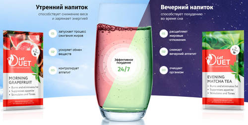 - Утренняя порция напитка направлена на ускорение обмена веществ и контроль аппетита. Let Duet с утра активизирует процесс жиросжигания и заряжает энергией на весь день.