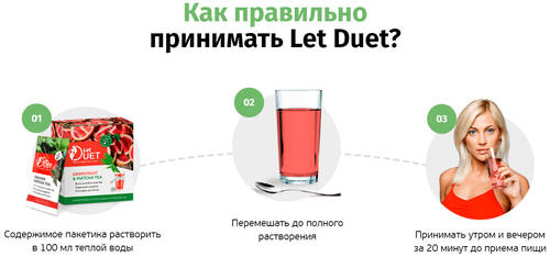 Стройное и подтянутое тело — мечта каждой девушки. По мнению многих, достичь идеальных пропорций можно лишь с помощью изнурительных тренировок и голодных диет, но это не так. Новинка Let Duet для похудения избавит вас от лишнего веса за короткое время и без особых усилий. Средство разработано на основе натуральных компонентов без добавления химических добавок. Производители обещают, что через неделю вы избавитесь от 5 килограммов, обретете уверенность в себе и будете ловить восхищенные взгляды мужчин.