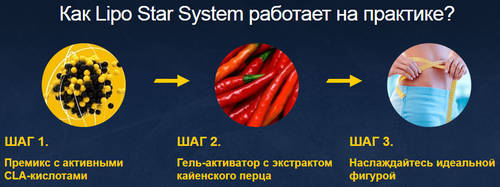 Если же вы начнете соблюдать вышеуказанные правила, то постепенно заметите, как похудели. Lipo Star поможет ускорить процессы жиросжигания, переводя жир в энергию, и вы не будете чувствовать усталости и станете проявлять большую активность на тренировках.