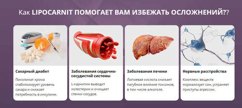 - Липокарнит выводит холестерин и нормализует уровень сахара.