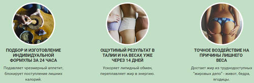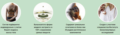 На официальном сайте есть небольшой тест, который рассчитает сколько у вас лишних килограммов. Программа учитывает, какой образ жизни вы ведете. Исходя из всех данных, будет подобран уникальный состав. У производителей в арсенале имеется около 30 компонентов, комбинации которых помогают избавиться от лишнего веса при любых особенностях организма.