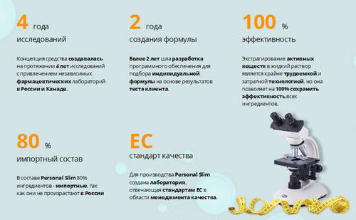Часть характеристик непосредственно относится к тем функциям, которые должен выполнять Personal Slim. Производитель здесь не слукавил. Но в основном списке есть обещание, что капли предотвращают развитие опухолевых изменений — скорее всего, это придумано для того, чтобы привлечь покупателей.