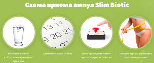 Пить SlimBiotic следует точно по инструкции, чтобы добиться желаемого эффекта. Схема применения предельно простая: содержимое одной ампулы следует запить стаканом чистой воды.